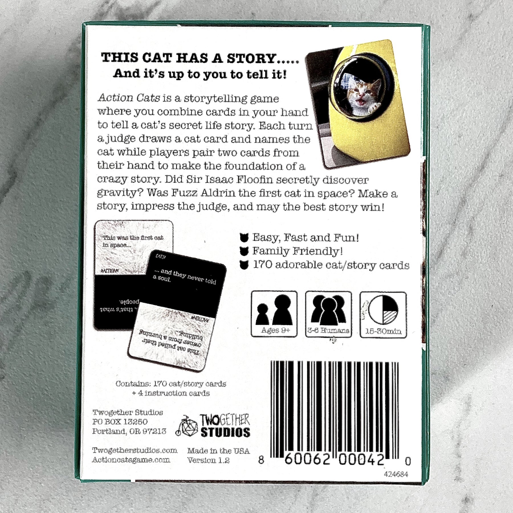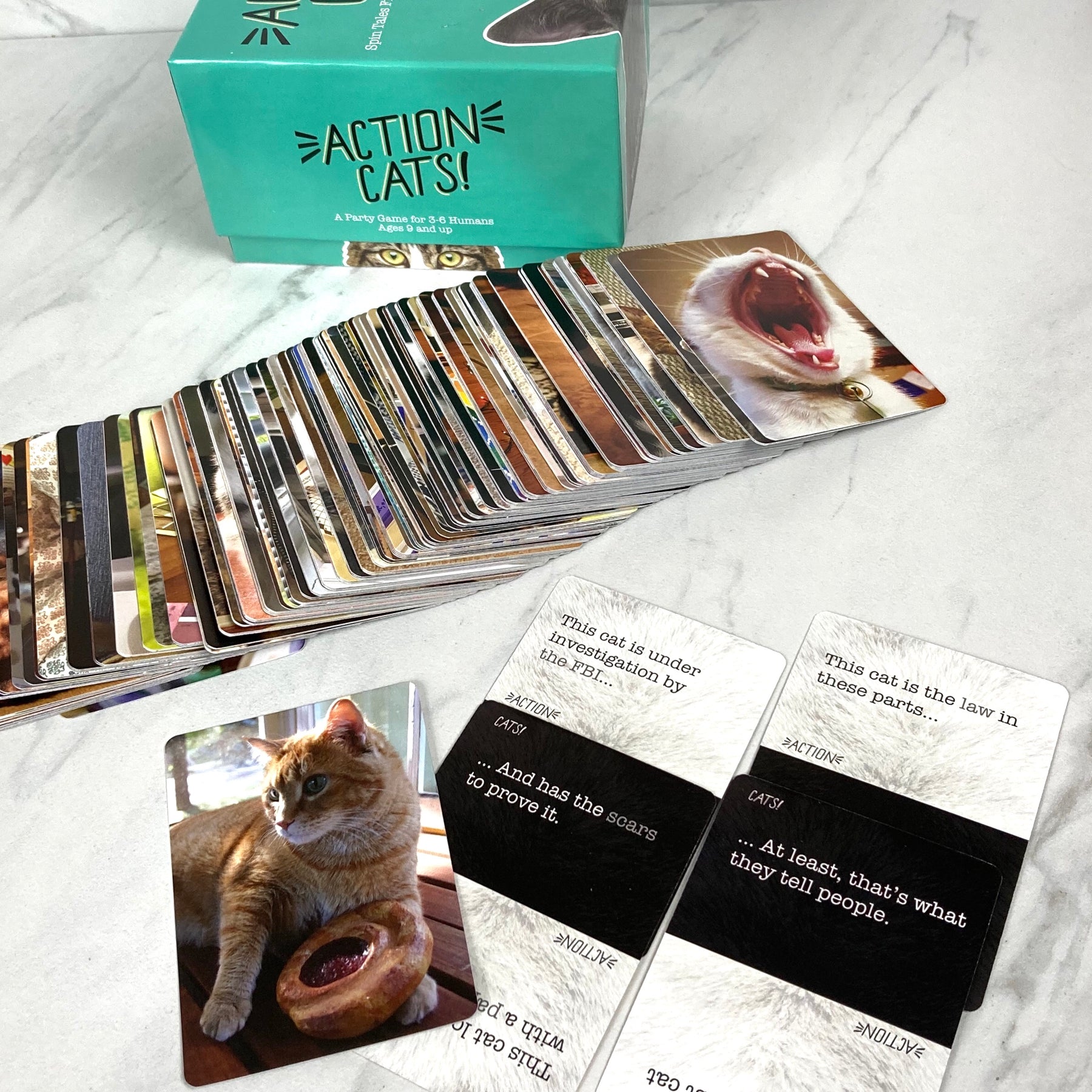 Is your cat a secret spy who thwarted enemy plans or a misunderstood artist who just needs time away from the spotlight? In Action Cats you take turns being judge as players combine cards and embellish to tell the secret life story of a cat and win the judges favor. Silly, fuzzy, and easy to learn.