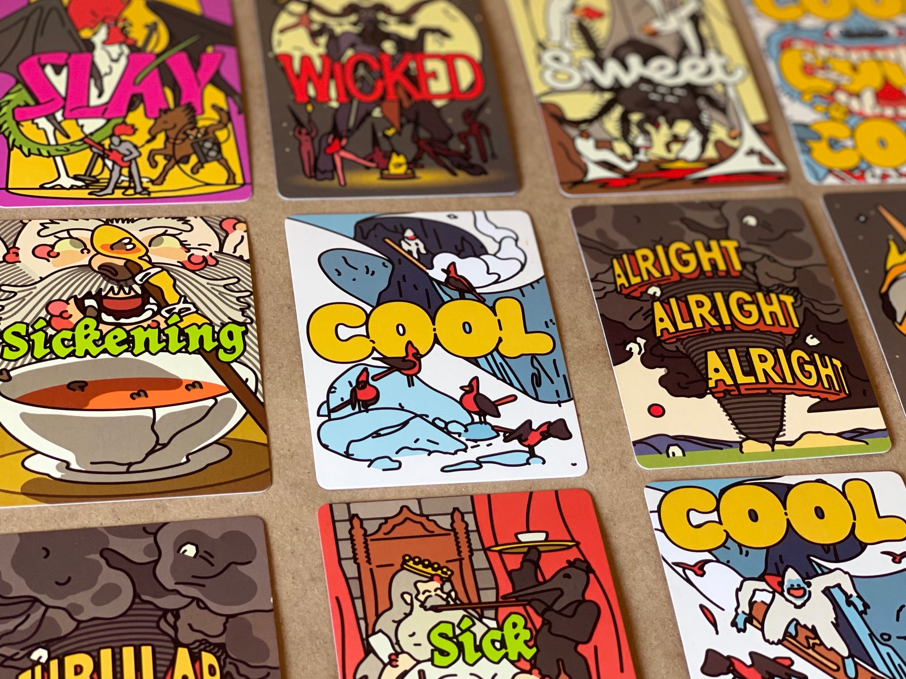 All the words in this game started as one meaning and became popularized to mean something else.  Words that are affirmations, roll off the tongue easily and feel kind of great when you shout them or hear your friends say them to you. Go ahead, unbox Cool Cool Cool and get ready to shout, slap, slay, and be delighted.
