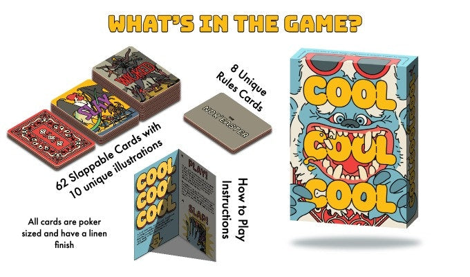 If you enjoy a game night with laughter, chaotic energy, and quick competition, this game is for you. Cool Cool Cool expands on the classic slap game genre with rule combinations that can change each time you play. Designed for 2-6 players ages 9-99 and a quick playtime of about 15 minutes that will leave you wanting to play another round.